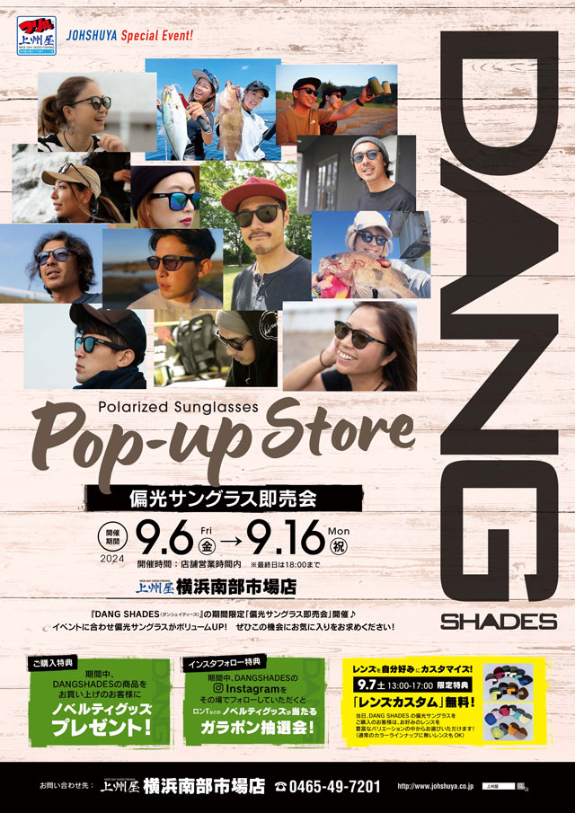 2024年9月6日(金)~16日(月/祝)の11日間、上州屋横浜南部市場店にDANG SHADES(ダン・シェイディーズ)偏光グラスのポップアップストアが登場します!