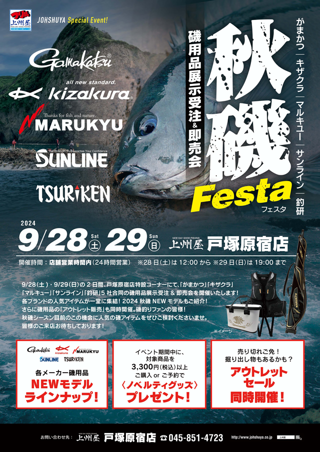 2024年9月28日(土)12:00~9月29日(日)19:00まで、上州屋戸塚原宿店にて磯用品の展示即売&受注会「秋磯フェスタ」を開催します!