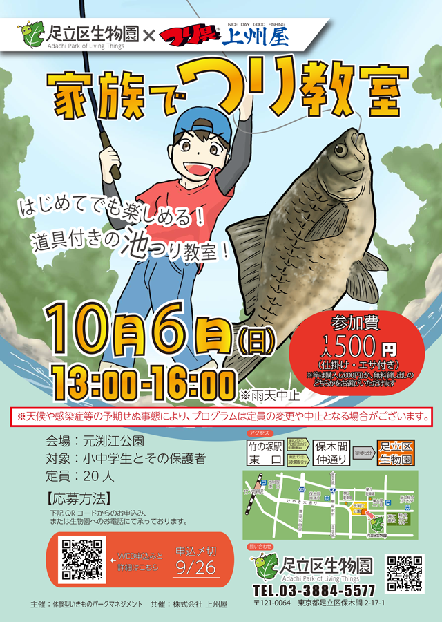 2024年10月6日(13:00~16:00、東京都足立区の元渕江公園にて、足立区生物園×上州屋「家族でつり教室」が開催されます!