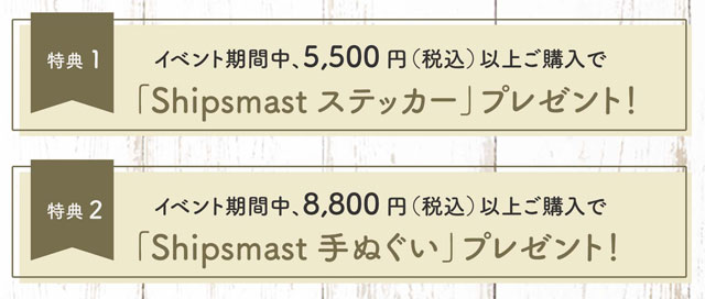 イベント期間中に対象製品を5,500円(税込)以上お買い上げで「Shipsmastステッカー」をプレゼント!