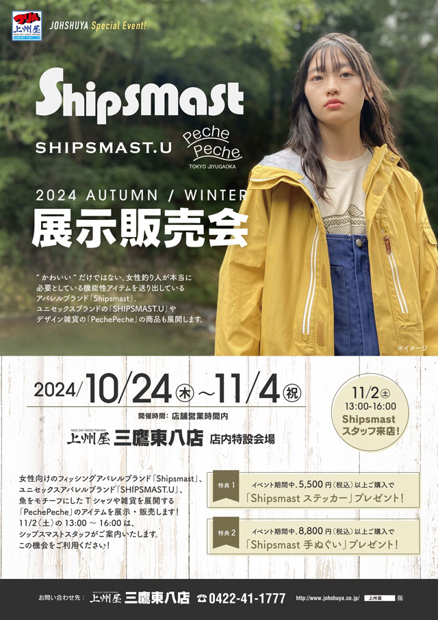 2024年10月24日(木)~11月4日(月/祝)の期間中、上州屋三鷹東八店にて女性アングラーに人気のフィッシングウェアブランド、Shipsmast(シップスマスト)の展示販売会を開催します!