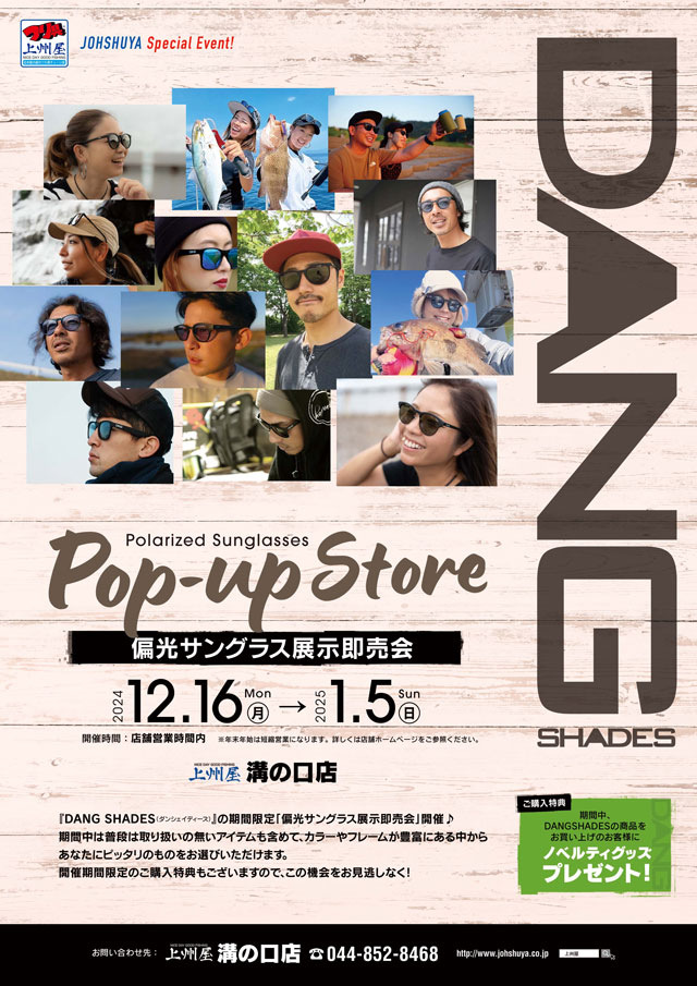 2024年12月16日(月)~2025年1月5日(日)の期間中、上州屋溝の口店にDANG SHADES(ダン・シェイディーズ)偏光グラスのポップアップストアが登場します!