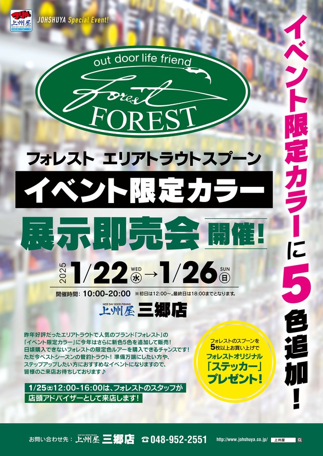 また、1月25日(土)12:00~16:00の時間帯にはフォレストメーカースタッフがアドバイザーとして来店!フォレストルアーの効果的な使い方、選び方、エリア攻略法etc.いろいろ聞いてしまいましょう!