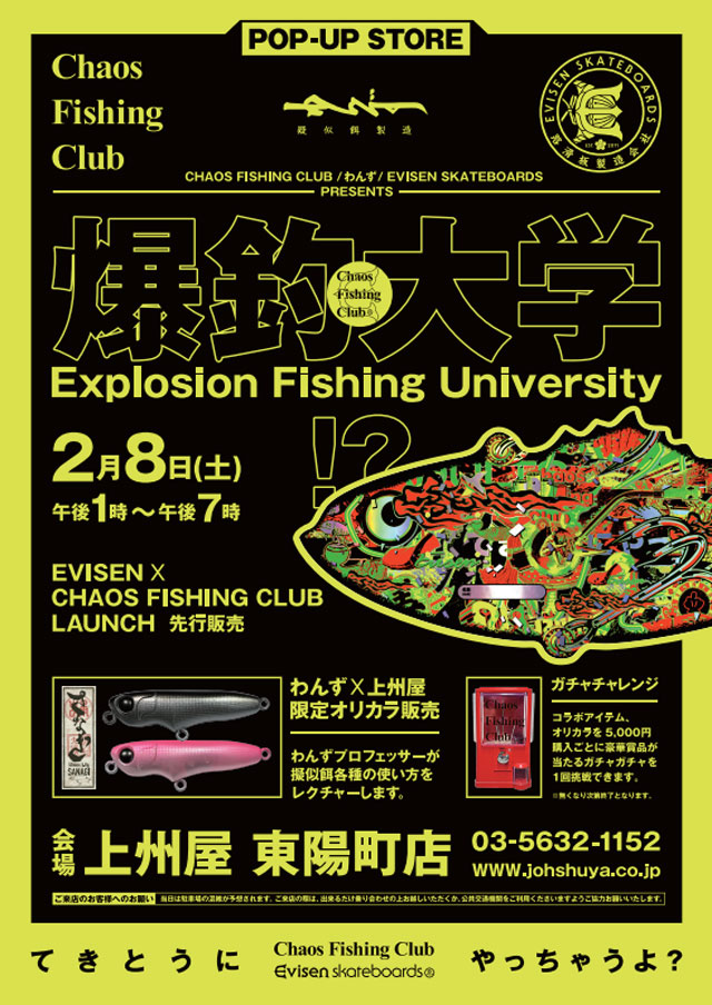 東京・深川を拠点に、独自のデザインと高品質な素材を使用したルアーを提供する“わんず”と、「てきとうにやっちゃうよ?」をコンセプトに釣りとスケートボードをこよなく愛する謎多きスケートブランド“Chaos Fishing Club”のインストアイベント!