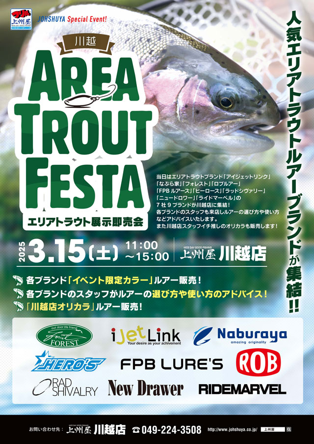 2025年3月15日(土)11:00~15:00、上州屋川越店にて“フォレスト”“アイジェットリンク”“なぶら家”“ヒーローズ”“FPBルアーズ”“ロブルアー”“ラッドシヴァリー”“ニュードロワー”“ライドマーベル”など人気エリア・トラウトメーカー7社9ブランドによる合同展示即売会「エリアトラウトフェスタ」を店頭開催します!