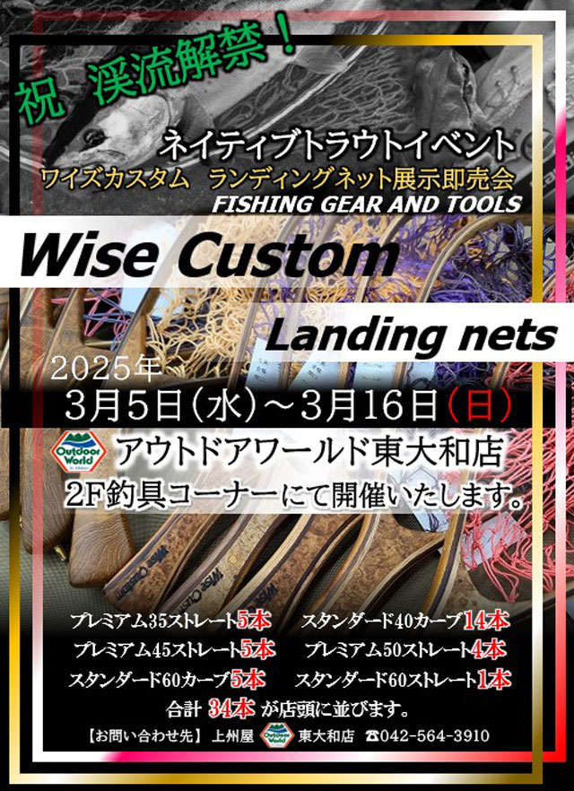 2025年3月5日(水)~16日(日)の12日間、上州屋アウトドアワールド東大和店にてワイズカスタム、ハンドメイドランディングネットの展示即売会を開催します!