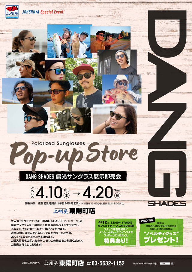 2025年4月10日(木)13:00~4月20日(日)18:00までの期間中、上州屋東陽町店にてDANG SHADES(ダン・シェイディーズ)偏光グラスの展示即売会を開催します!