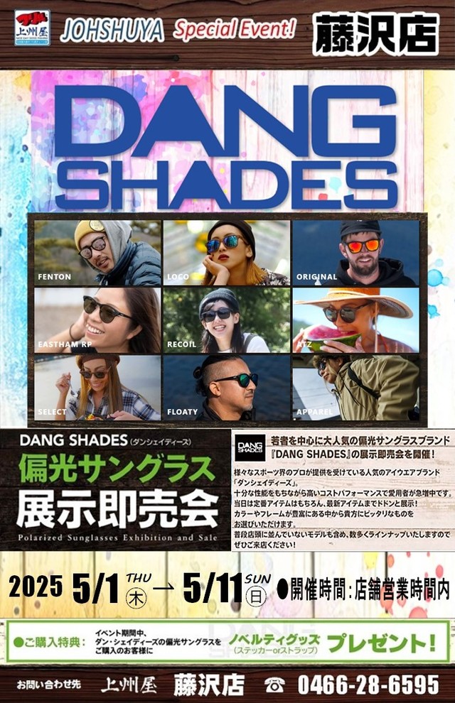 2025年5月1日(木)~11の11日間上州屋藤沢店にてDANG SHADES(ダン・シェイディーズ)偏光グラスの展示即売会を開催します!