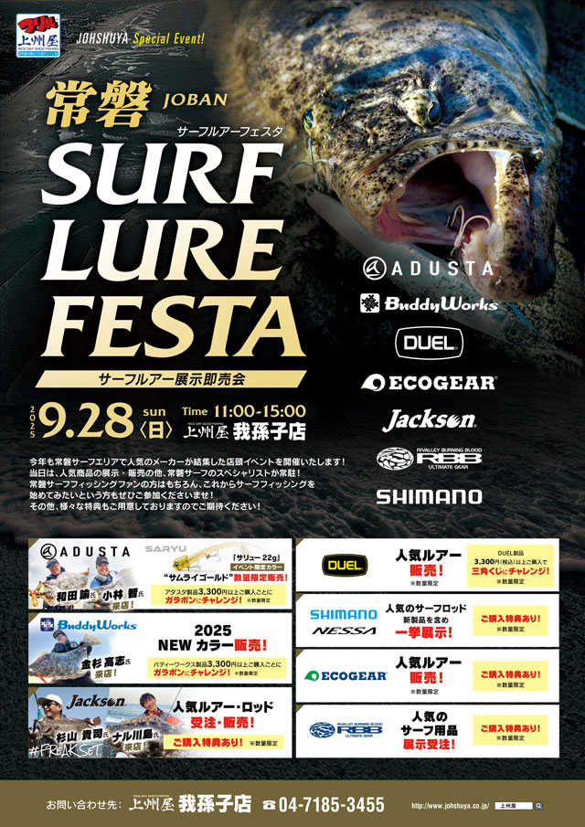 2025年9月28日(日)11:00~15:00、上州屋我孫子店にて常磐サーフルアーフェスタを開催します。「アダスタ」「バディーワークス」「ジャクソン」「DUEL」「シマノ」「エコギア」「RBB」など人気7社が店頭に大集合!!