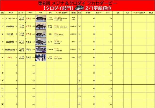 メジナ部門・クロダイ部門、2/1更新最終順位発表(1月分集計)。