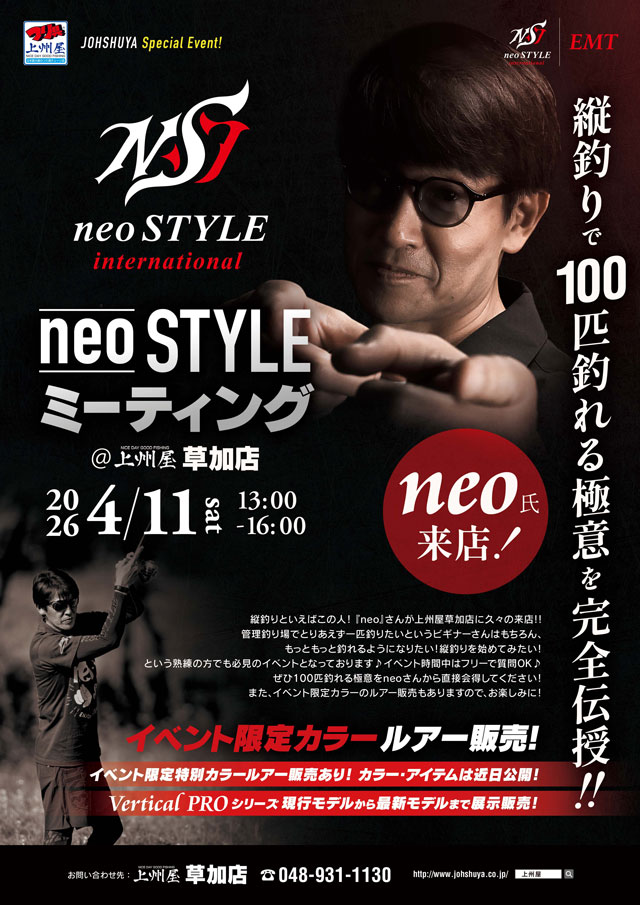 2026年4月11日(土)13:00~16:00、上州屋草加店にネオスタイル“neo氏”が来店!店頭にてneoSTYLEミーティングを開催し、「縦釣りで100匹釣れる極意」を伝授してくれます!