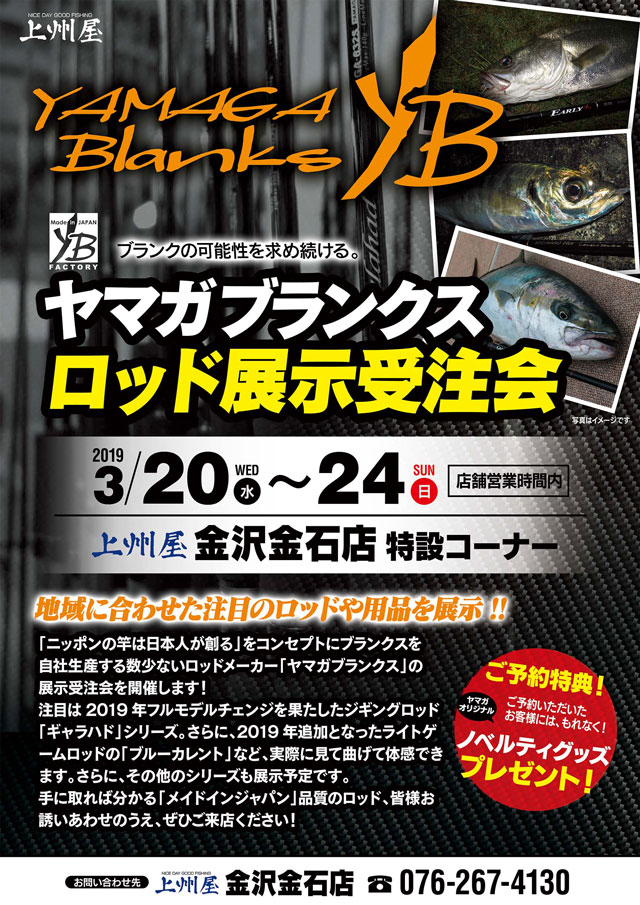 2019年3月20日(水)~24日(日)の5日間(開催時間は店舗営業時間に準拠)、上州屋金沢金石店にて「ヤマガブランクスロッド展示受注会」を開催します!