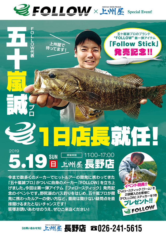今まで数多くのメーカーでヒットルアーの開発に携わってきた五十嵐プロがついに自身のメーカーFOLLOWを立ち上げました!今回は第一弾アイテム「フォロースティック」発売記念イベントです!イベント特典としてフォロースティック(ワーム)を2袋購入のお客様にFOLLOWステッカーを1枚プレゼント!