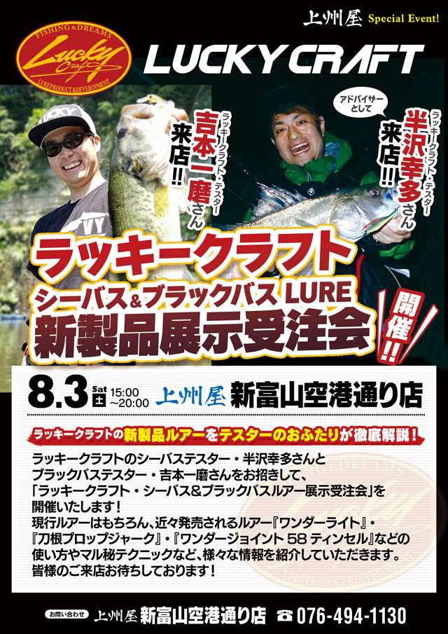 【新富山空港通り店】ラッキークラフト“シーバス&ブラックバスルアー”新製品展示受注会!吉本一麿さん&半沢幸多さんが来店します!