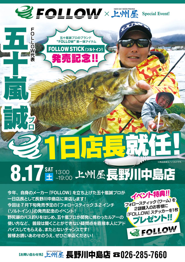 2019年8月17日(土)13:00~19:00(予定)、上州屋長野川中島店に野尻湖のスペシャリストにして、今年自身のメーカー「FOLLOW」を立ち上げた五十嵐誠プロが1日店長として来店します!野尻湖のバス釣りや、五十嵐プロが開発に携わったルアーの使い方など、普段は聞けない疑問点を直接聞けるまたとないチャンス!