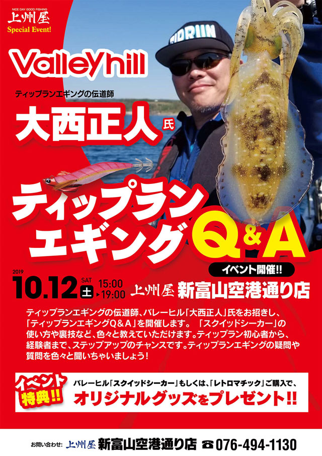 2019年10月12日(土)15:00~19:00(予定)上州屋新富山空港通り店にティップランエギングの伝道師、バレーヒル「大西正人」さんが来店、ティップランエギングQ&Aを開催します!