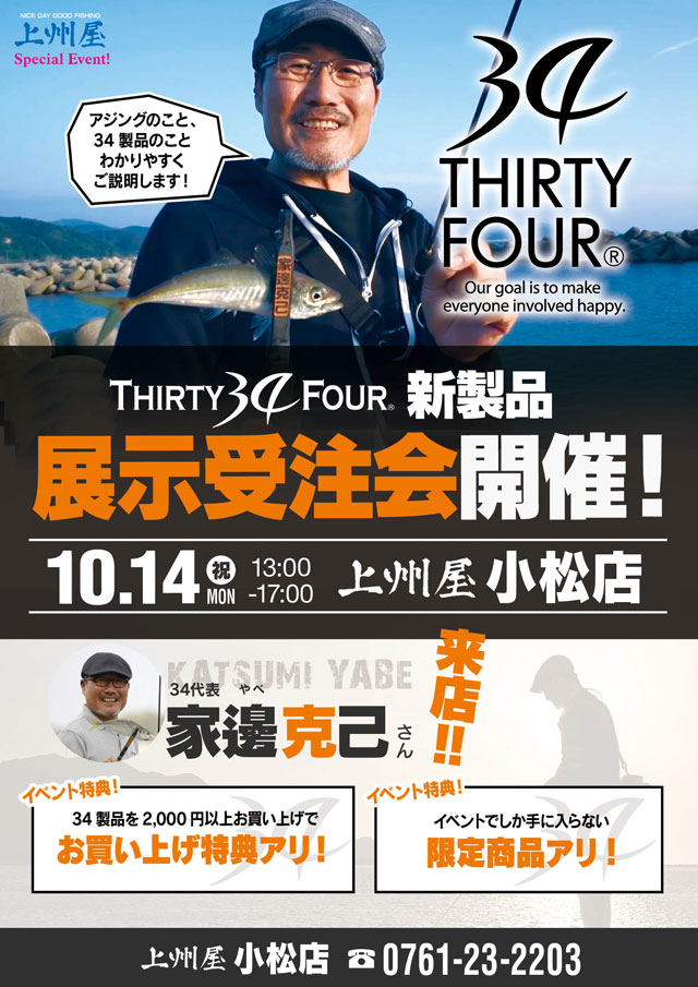 2019年10月14日(月/13:00~17:00(予定)、上州屋小松店にTHIRTY34FOUR代表、家邊克己さんが来店!34新製品展示&受注会開催します!