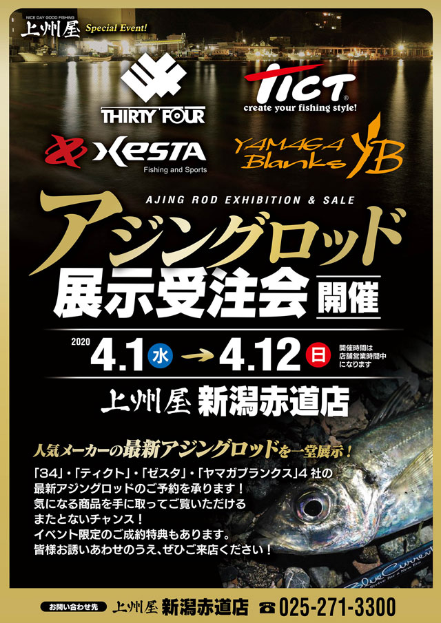 2020年4月1日(水)~12日(日)、上州屋新潟赤道店に人気メーカーの最新アジングロッドが勢ぞろい!「34」「ティクト」「ゼスタ」「ヤマガブランクス」4社合同の展示受注会を開催します!