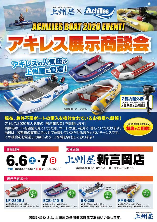 2020年6月6日(土)10:00~16:00および6月7日(日)10:00~15:00の2日間、上州屋新高岡店にてアキレス2020免許不要ボートの店頭展示を行います。