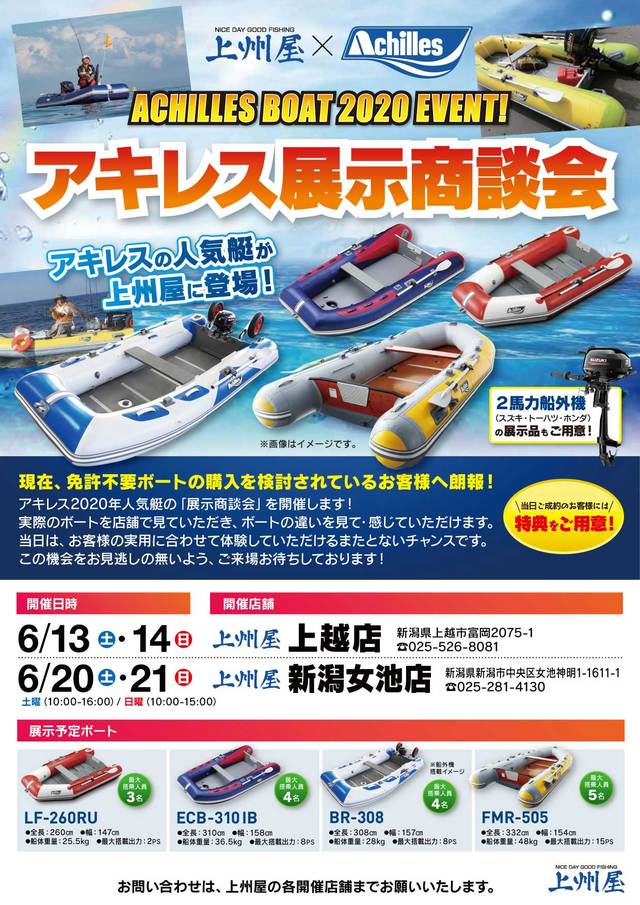 2020年6月20日(土)10:00~16:00および6月21日(日)10:00~15:00の2日間、上州屋新潟女池店にてアキレス2020免許不要ボートの店頭展示を行います。