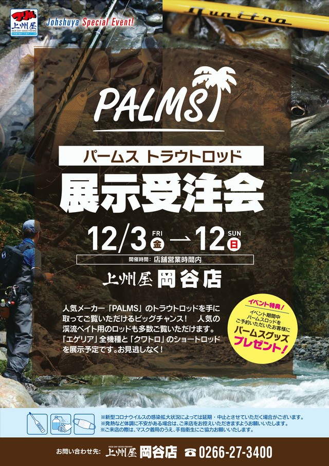 2021年12月3日(金)~12日(の間、上州屋岡谷店にて人気ブランド、パームスの「トラウトロッド展示受注会」を開催します!
