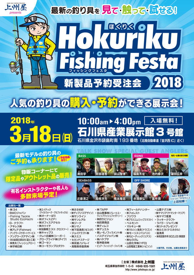 2018年3月18日(10:00~16:00、石川県金沢市石川県産業展示館にて「ほくりくフィッシングフェスタ新製品予約受注会2018」開催!人気の釣具の購入・予約ができる大展示会です!