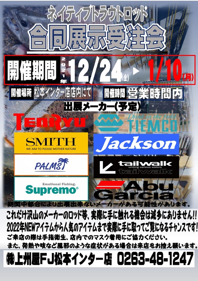 2021年12月24日(金)~翌2022年1月10日(月/祝)の間、上州屋松本インター店にてネイティブトラウトロッド合同展示受注会を開催いたします!