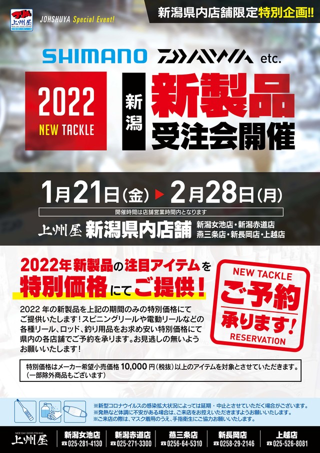2022年1月21日(金)~2月28日(月)新潟県内上州屋各店にてシマノ、ダイワetc.2022年新製品や注目アイテムを特別価格にてご予約承る「2022新潟新製品受注会」を開催します!