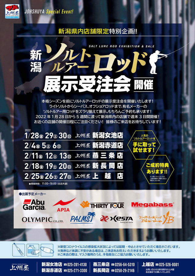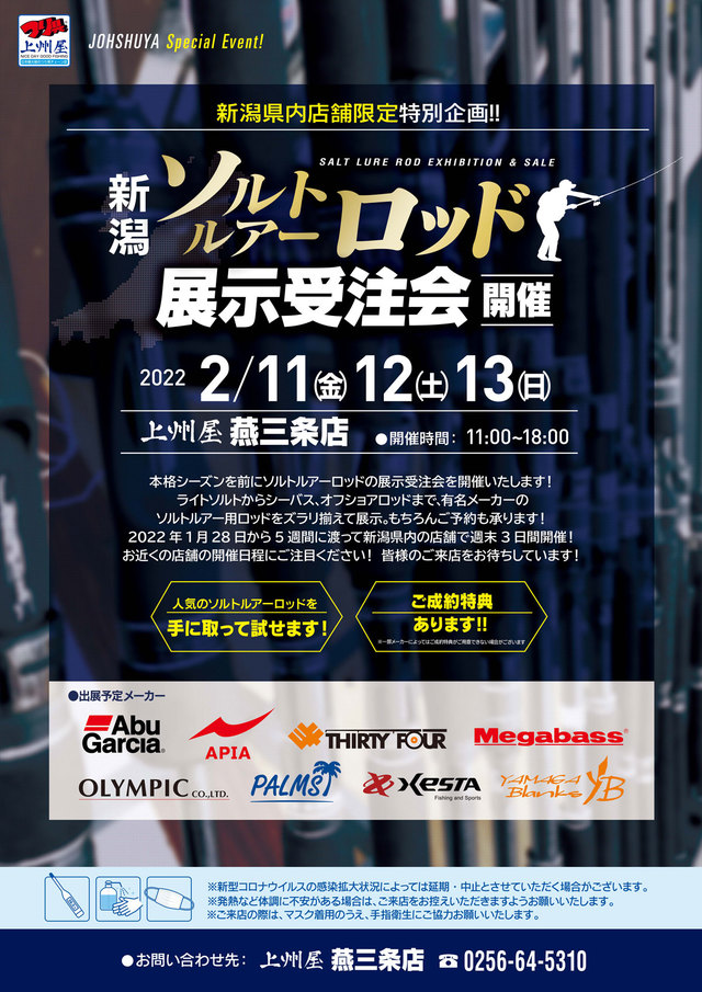 2022年2月11日(金)、12日(土)、13日(日)週末3日間の11:00~18:00(予定)、上州屋燕三条店にて人気メーカー各社のソルトルアーロッド展示受注会を開催します!ライトソルトからシーバス・オフショアロッドまで、各社の人気製品、新製品をズラリ揃えて展示の上、ご予約を承ります。