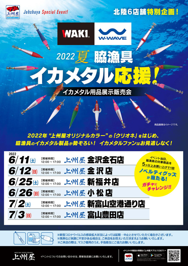 2022年6月25日()上州屋新福井店、翌6月26日()上州屋小松店にてWAKI(脇漁具)イカメタル用品展示販売会を開催します!