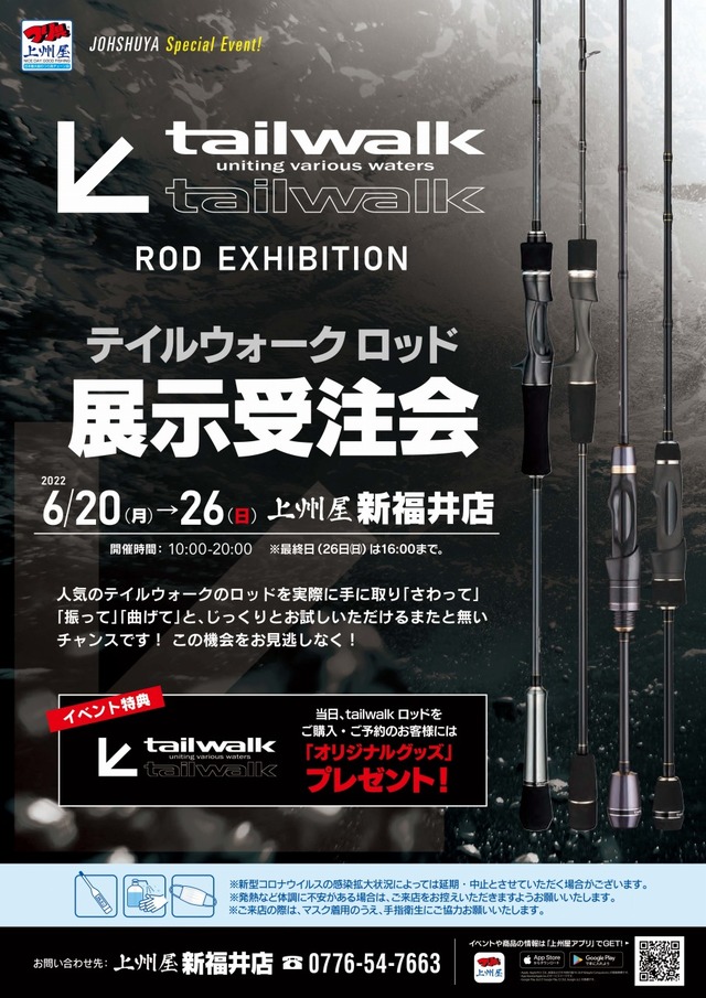 2022年6月20日(月)~26日(日)の7日間、上州屋新福井店にてアジング・エギング・ショアジギングロッドetc. tailwalk|テイルウォーク社のロッド展示受注会を開催します!また、同日程にてアルファタックルの船竿も展示受注承ります!
