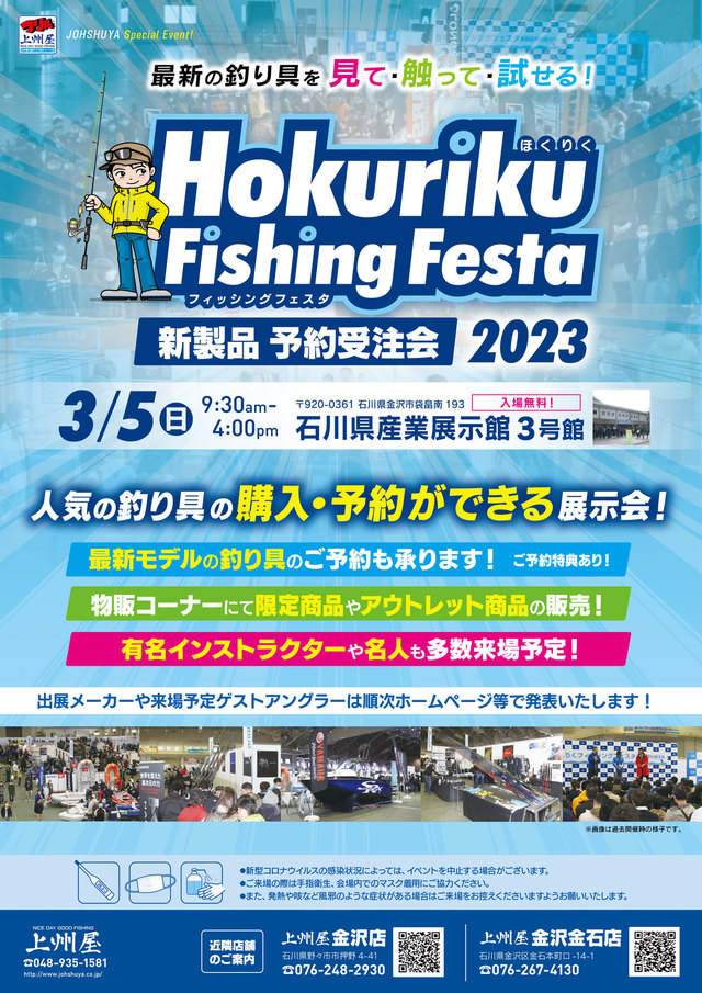 2023年3月5日(日)9:30~16:00、石川県金沢市石川県産業展示館3号館にて人気釣具の購入・予約ができる大展示会「ほくりくフィッシングフェスタ新製品予約受注会2023」を開催いたします!