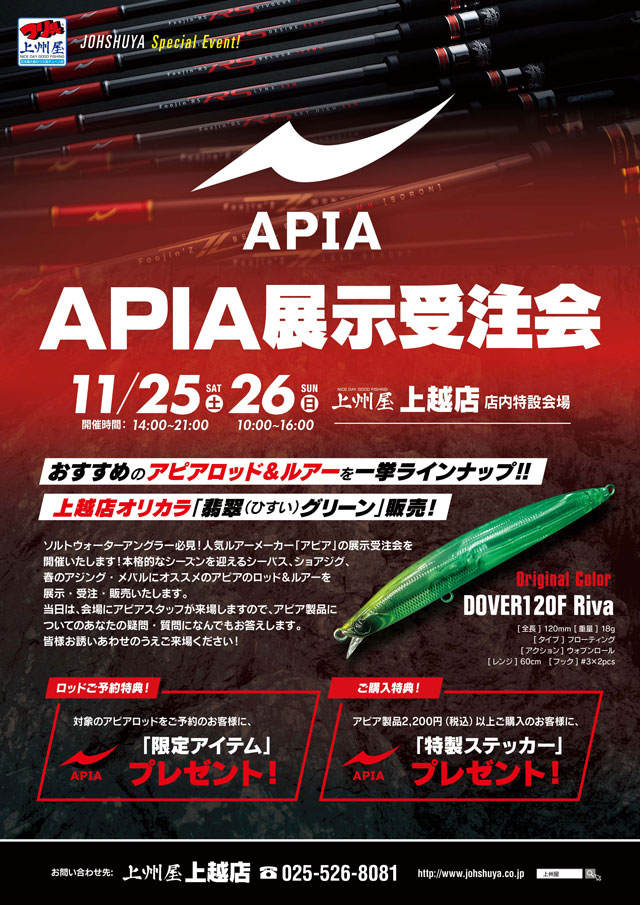 の2日間、上州屋上越店にてAPIA(アピア)のロッド&ルアーの展示受注販売会を開催します!