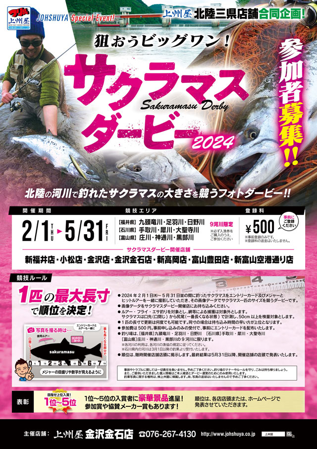 登録方法:サクラマスダービー開催各店、店頭にてエントリー承ります。事前登録の上、営業時間中の店頭に指定の方法で撮影された画像データをお持込下さい。