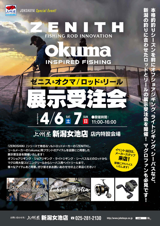 2024年4月6日(土)、7日(日)2日間の各日11:00~16:00、上州屋新潟女池店にてZENITHゼニス&okumaオクマのロッド&リール展示受注会を開催します!