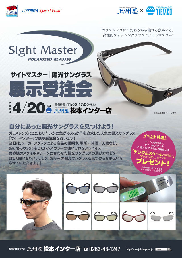 2024年4月20日(土)11:00~17:00、上州屋松本インター店にてティムコ社「サイトマスター」偏光グラスの展示受注会を開催します。