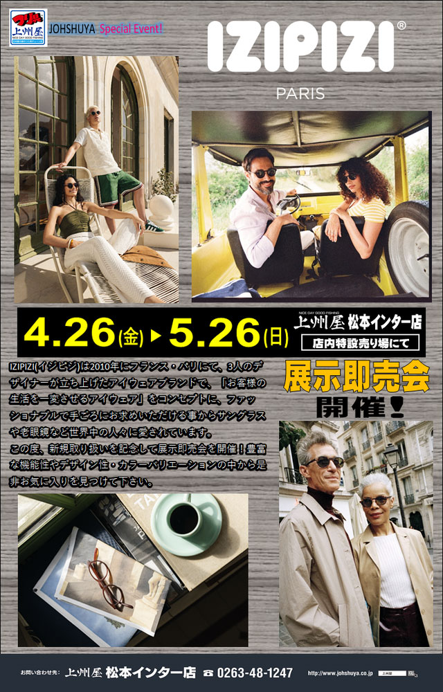 2024年4月26日(金)~5月26日(日)期間中、上州屋松本インター店にてフランス発のアイウェアブランド、IZIPIZI(イジピジ)の偏光グラス展示即売会を開催します。