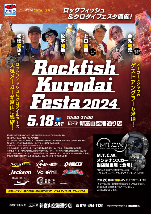 2024年5月18日(土)10:00~17:00、上州屋新富山空港通り店にてロックフィッシュ&クロダイフェスタ2024開催!当日はロックフィッシュ&クロダイルアーの人気メーカーが新富山空港通り店に集結する他、メーカースタッフやゲストアングラーも続々来店します!