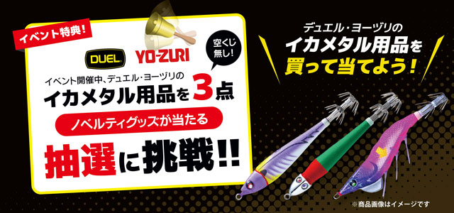 今回イベントにてDUELデュエル、YO-ZURIヨーズリの対象イカメタル商品を3点お買い上げで、ノベルティグッズが当たる抽選にチャレンジできます!