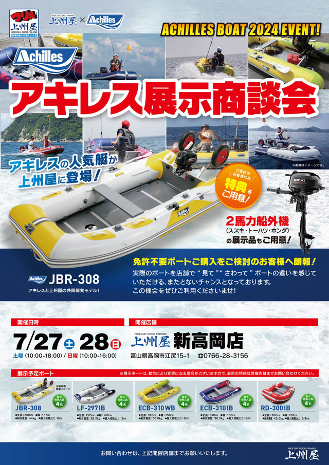 の2日間、上州屋新高岡店にてアキレス2024免許不要ボートの店頭展示商談会を開催します。