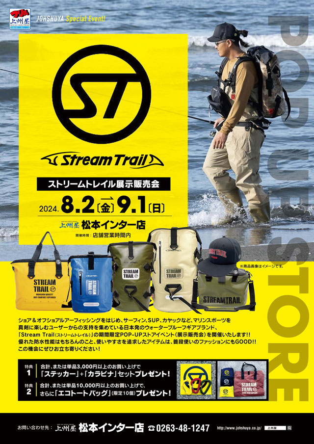 2024年8月2日(金)~9月1日(日)の期間中、上州屋松本インター店にてストリームトレイル展示販売会を開催!店内に特設POPUPコーナーが登場します!