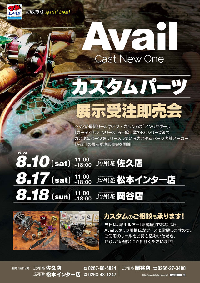 シマノ最新リールや、アブのアンバサダー、カーディナル、五十鈴工業のBCシリーズなどのリールカスタムパーツ、チューニングアップパーツ、ドレスアップパーツetc.の老舗製造メーカーとして定評あるAvail(アベイル)の店頭イベント!