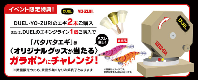 DUEL・YO-ZURIの対象エギを2本ご購入、もしくはDUEL対象エギングライン1個ご購入で、ノベルティグッズが当る!ガラポンに挑戦頂けます!