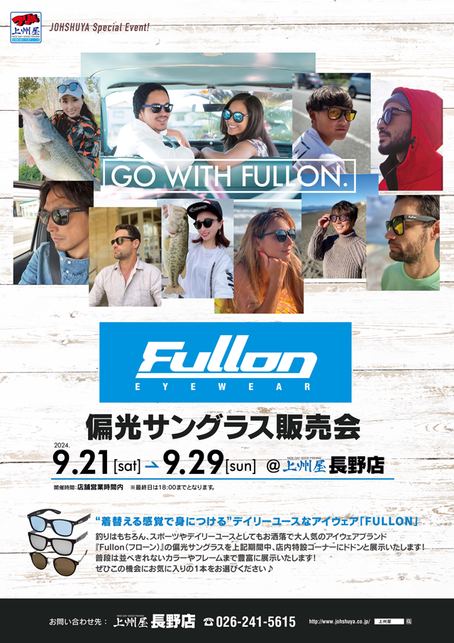 2024年9月21日(土)~29日(日)の9日間、上州屋長野店にてFullon(フローン)偏光グラスの展示販売会を開催します!