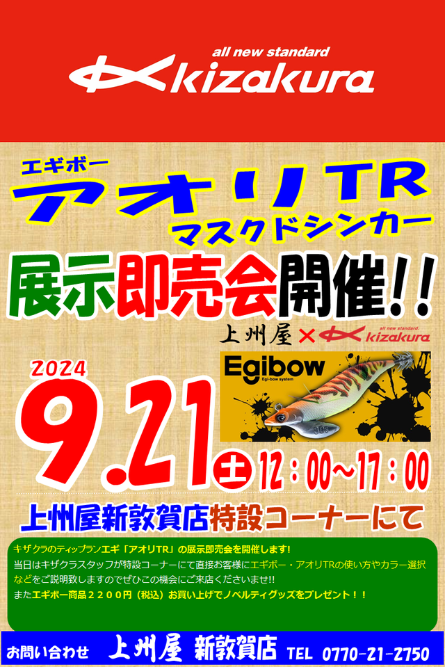 2024年9月21日(土)12:00~17:00、上州屋新敦賀店にてキザクラ・ティップランエギング用品の展示即売会を開催します!