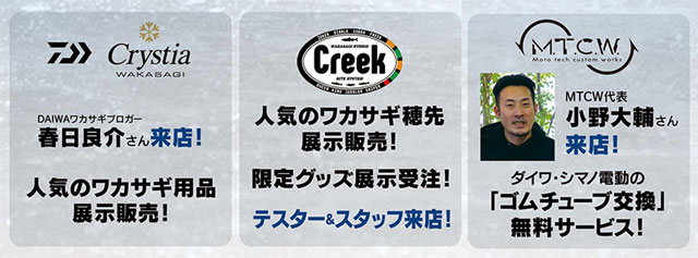 当日はDAIWAワカサギブロガー春日良介さん、釣工房クリーク代表 矢作仁さん、クリークテスター田辺猛さん、クリークテスター淺野俊彦さん、クリークテスター三好正邦さん、クリークテスター斎藤優作さん、MTCW代表 小野大輔さんが来店