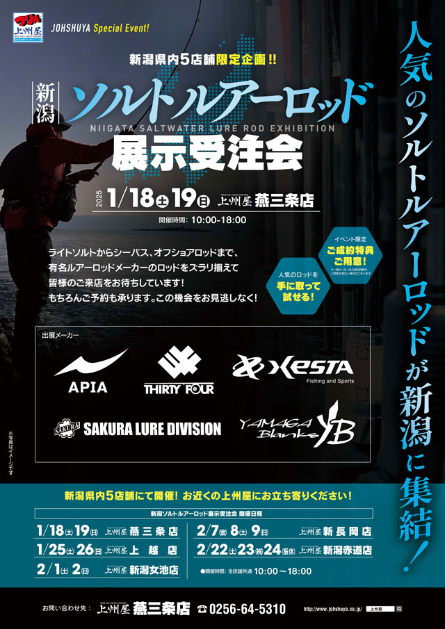 2025年1月18日(土)、19日(日)の各日10:00~18:00、上州屋燕三条店にて人気メーカー5社のソルトルアーロッド展示受注会を開催します!