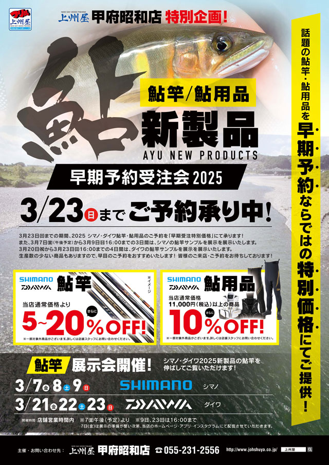 2025年3月7日(金)、8日(土)、9日(日)の3日間、上州屋甲府昭和店にてSHIMANO鮎竿2025新製品展示受注会を開催します!