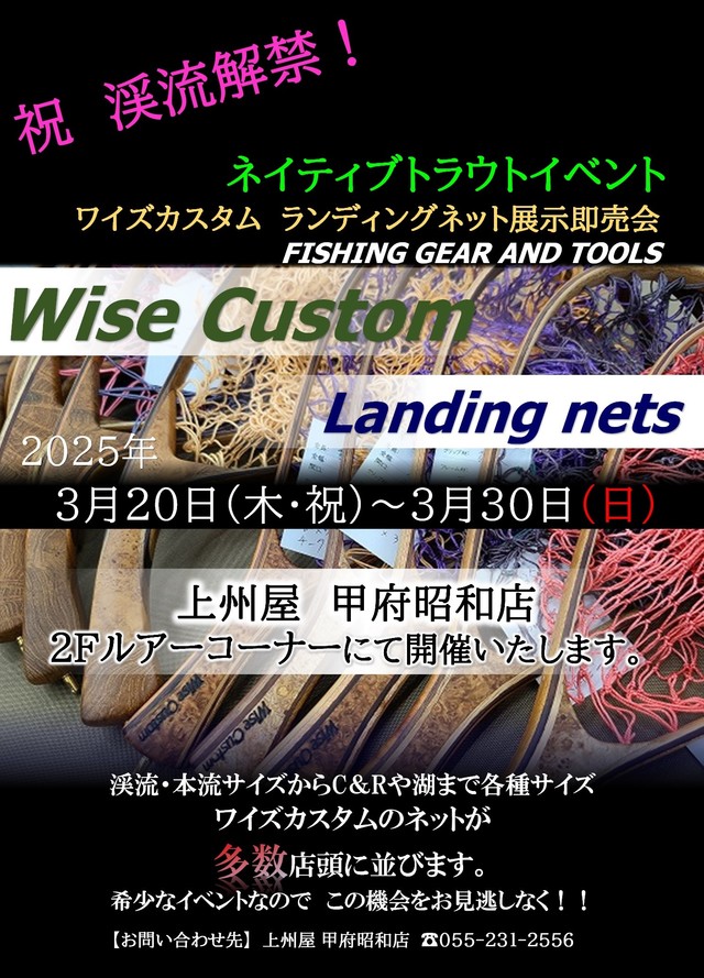 2025年3月20日(木/祝)~30日(日)の11日間、上州屋甲府昭和店にてワイズカスタム、ハンドメイドランディングネットの展示即売会を開催します!