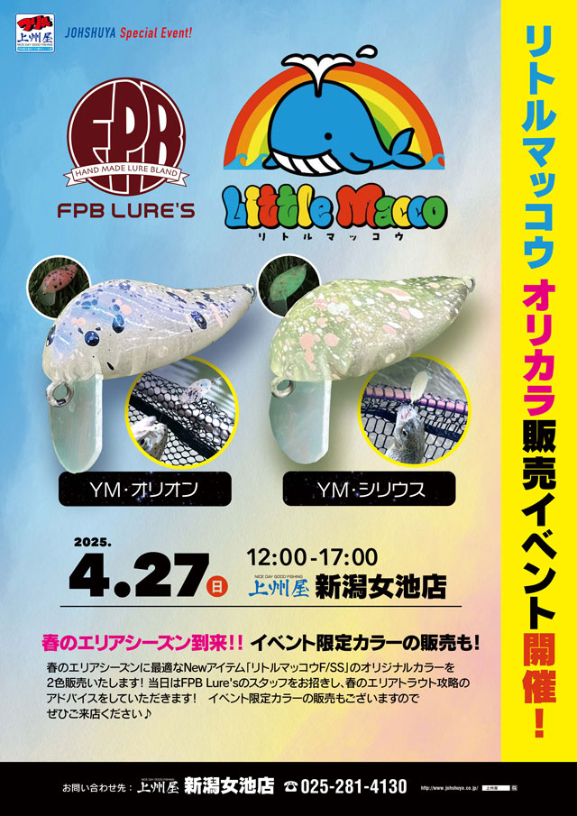 2025年4月27日(日)12:00~17:00、上州屋新潟女池店にて人気ルアーメーカーFPBルアーズのエリアトラウトルアー「リトルマッコウ」のオリカラ販売会を開催します!